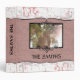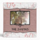 Elegant pink and diamond dust marble trim surrounds rose faux leather background. Photo and text templates created for you. Photo template on front with two beautiful black scroll photo holders at top and bottom of photo.