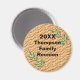 Create an inexpensive keepsake for your next family reunion with these unique magnets. The year and your family's name appears in the centre of this round refrigerator magnet. The text is surrounded by tree branches with bright green leaves. The brown background resembles a basket weave or cracked earth pattern. All text can easily be personalized for your large family gathering.