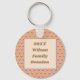 The pattern on this family reunion keychain features a vivid blue polka dot pattern against a dark peach background. The centre features a blue grey outlined rectangle with pale peach middle providing the background for your family name and year. Keychains provide an inexpensive yet useful keepsake for your next family reunion.