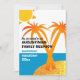 Family Reunion Summer Vacation invitation, with customizable family name and palm trees. The design shows sun, palm trees, blue horizon and golden glitter beach, with bold typography. Simply customize this reunion invitation with the family name on the front and personalize your vacation details and instructions on the back. Get matching gifts for all the family to make your next trip a holiday to remember.