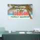 Family Reunion Welcome banner with a tropical beach background scene with a leaning palm tree, sand, and aqua blue ocean. You can edit all text including the family name. Great for a beach reunion or for a luau or tiki theme party. The background art is made from an artistically rendered photograph made to look more like a painting.