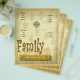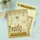 This flyer celebrates family. It has a vintage scrapbook look with a tan and gold colour scheme. Download your own images or just remove the text and add your other elements by hand later. Edit the text, use a plain colour background if desired. The background is tea stained tan colour with a subtle typography with family relationships. There is also a faint silhouette of trees along the bottom. There is a gold medallion in the centre of the upper part of the design. You can remove the medallion for a more plain look. You can also add information on the back.