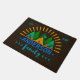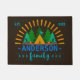 This personalized doormat is perfect for a family who loves camping and the outdoors. It has a sun ray motif in orange above a scene that includes pine trees, a tent and four stick figures peeking out from behind the tent or roasting hot dogs over a fire.