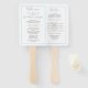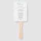 Minimalist fan wedding programs on a stick. White board with grey text templates in modern handwritten fonts to personalize for your event. Once the cards are attached to the stick, text will be on both sides. A thin, aqua blue line frames the text for a simple presentation that will match any theme.