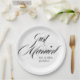 Elevate your wedding reception with our exquisite paper plates, featuring a stunning "Just Married" design in elegant script. Easily personalize using our template, or make further colour or text changes using the design tool.