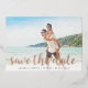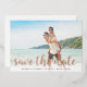 A modern wedding save the date card designed to accommodate your favorite horizontal or landscape oriented full-bleed engagement photo. "Save the date" appears as a foil text overlay in hand lettered calligraphy script. Personalize with your names, wedding date and wedding location beneath. Ideal for lighter colored photos.