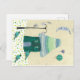 A playful, fanciful, imaginative postcard, with a tiny house, a hot air balloon, a lamp post, a crescent moon, three birds, and polka dotted sand.