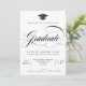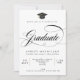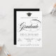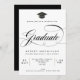 A fancy and elegant graduation invitation featuring a black graduation cap with faux gold tassels, and "graduate" in black script calligraphy font, on a white background. The reverse is in solid black.