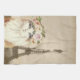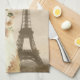 Fun kitchen towel for cat lovers features vintage sepia tint background photo of the Eiffel Tower with overlay of beautiful fancy cat with floral crown.