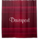 A shower curtain with a red background decorated with elegant swirls and ornamental designs along the borders.