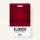 Personalized name badge with a red background decorated with elegant swirls and ornamental designs along the borders.
