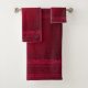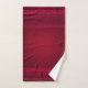 Towel set with a red background decorated with elegant swirls and ornamental designs along the borders.