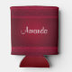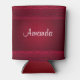 Personalized can cooler with a red background decorated with elegant swirls and ornamental designs along the borders.