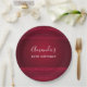 Birthday paper plates with a red background decorated with elegant swirls and ornamental designs along the borders.