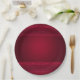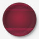 Paper plates with a red background decorated with elegant swirls and ornamental designs along the borders.