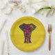 paper plates with an elephant illustration with bright and bold colours with decorative floral and mandela style pattern. The background is a stripedvintage style design in a warm yellow colour.