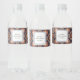 Water bottle labels with a repeating pattern of decorative ornate elements in flower, star and sun shapes.