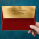 Elegant all-purpose envelope done in rich red, with graphics of a gold ornamental swirl, on the front and a solid gold back flap. Inside the envelope there is graphics of a solid gold lining. Personalize the return address to suit your needs. Great for special occasion invites, thank you cards and announcements.