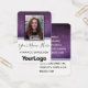 Faux violet purple and black glitter sparkles delightfully behind a photo template with black and white frame. Easily update the name and professional job title. There is also space for a company logo—delete to leave blank. Backside features more faux glitter and text templates for social media handles and contact information. Available in many other styles and colours.