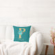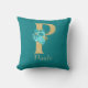 Pretty throw pillow features gold glitter letter 'P' with aqua roses and gold floral bouquet on a teal background. Personalize with name in gold coloured font.