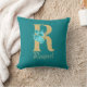 Pretty throw pillow features gold glitter letter 'R' with aqua roses and gold floral bouquet on a teal background. Personalize with name in gold coloured font.