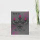 My drawing of an elegant Gothic candle holder in black and grey with bat wings, swirls, and hot pink drippy candles and pink jewels on a grungy grey background with hot pink swirls. Shown here on a wedding thank you card.