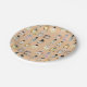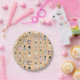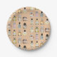 Paper party plates featuring a watercolor pattern of fancy famous maker perfume bottles on light peach background.