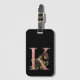 Fancy pink glitter letter K with gold leaves and swirls overlay and a coppery butterfly on grey background.
