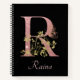 Fancy pink glitter letter R with gold leaves and swirls overlay and a coppery butterfly . Personalize with customizable pink text