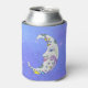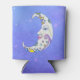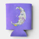 This can or bottle cooler has a fancy white crescent moon with a smiling face with colourful abstract shapes including circles, triangles, and a scroll in blue yellow, and purple on a purple sky background with dotted stars.