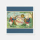 Two white bunnies, dressed in fancy costumes, are playing musical instruments. One is beating on a drum and the other one is playing the cymbals. Message: Easter Greeting. Image of a Vintage Easter postcard on a custom cyan-blue background.
