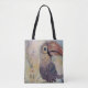 A colourful toucan with a large beak is depicted against a soft-hued background featuring delicate flowers. It appears perched, with its feathers rendered in a textured manner, giving the bird a lifelike and vibrant presence. Nature pals in print -- GardenGoonies -- Fantasy Bird Tote created from original acrylic art -- Spread one laugh at a time
