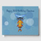 This custom guest book for your party or celebration has a fantasy owl with a blue head, yellow body and colourful wings and tail with big round blue eyes on a blue background with circles and dashes. Customize your information with the template.