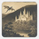 A towering, majestic castle built into the side of a mountain, surrounded by a magical landscape of rolling hills, forests, and a sparkling river. Dragons fly overhead, and the castle is illuminated by the golden light of the setting sun.