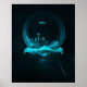 A giant snowglobe contains a metropolitan cityscape with a flying blimp above. The globe sits on an icy pedestal with wires coming out and fading into the darkness. Cool fantasy design in black and turquoise blue. The setting has a icy yet tranquil feel.