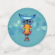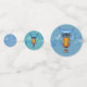 This table confetti has a fantasy colourful owl with a yellow body, blue head and big blue eyes on a background of circles and dashes in various shades of blue and green.