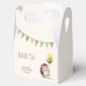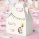 Adorable kid's birthday thank you favour box featuring a cute cheerful hedgehog holding a balloon with party flag background.