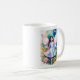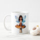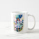 Mug with two young girls with fairy wings. One is sitting on a mushroom and the other one is standing amidst a vibrant garden filled with colourful flowers and butterflies.