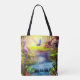 This tote bag features a fantasy forest with a waterfall, butterfly, birds and fairy houses.