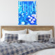 Canvas in a semi-abstract illustration of a fantasy forest with flowers, foliage, trees and birds, in shades of cobalt blue and white