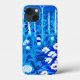 Phone case in a semi-abstract illustration of a fantasy forest with flowers, foliage, trees and birds, in shades of cobalt blue and white