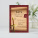 Fantasy knight's sword Jewish Bar Mitzvah rsvp card. This medieval times fantasy sword and sorcery Bar Mitzvah reply card features a red velvet look background, a simulated parchment scroll, a knight's, king's, or prince's sword, and a wax seal with a subtle Jewish Star of David.