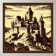 Look no further than this stunning design of a medieval castle, done in the style of a woodblock print. This illustration depicts a majestic castle perched atop a cliff. This design is sure to be a conversation starter and will add a touch of elegance and history to any room.