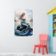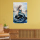Poster of a serene mermaid with long flowing hair sitting gracefully on a rock surrounded by calm ocean waters and distant cliffs. Soft pastel colours enhance the tranquil and magical atmosphere of the scene.