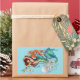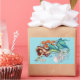 An auburn-haired mermaid with a teal tail, gracefully poised against a light blue backdrop. Surrounding her are blue water bubbles In front of her, a jellyfish in light pink and white, while a large orange seahorse floats beside her, adding a splash of vibrant contrast. From her outstretched right hand, seashells and a pearl necklace tumble downward. Adorned with shimmering gold bracelets