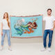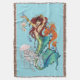 An auburn-haired mermaid with a teal tail, gracefully poised against a light blue backdrop. Surrounding her are blue water bubbles In front of her, a jellyfish in light pink and white, while a large orange seahorse floats beside her, adding a splash of vibrant contrast. From her outstretched right hand, seashells and a pearl necklace tumble downward. Adorned with shimmering gold bracelets