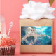 Ethereal blue sky - full moon glowing through the clouds- Beautiful blonde Moon Goddess, Sky Siren pointing to her beautiful White dove carrying a single rose