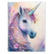 6.5 x 8.75 notebook with a majestic unicorn amidst a dreamy background of soft pastel colours with a flowing mane adorned with delicate flowers, creating an enchanting scene.