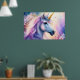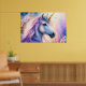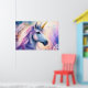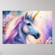 Poster with a majestic unicorn amidst a dreamy background of soft pastel colours with a flowing mane adorned with delicate flowers, creating an enchanting scene.