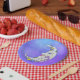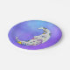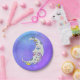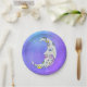 This paper plate has a fantasy white crescent moon with a face and fancy colourful abstract markings of various shapes in purple, blue, and yellow on a mixed purple and blue sky background.